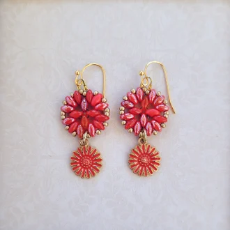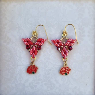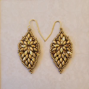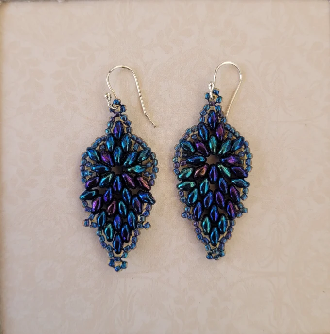 Iris super-duos with peacock seed beads on silver earwires.