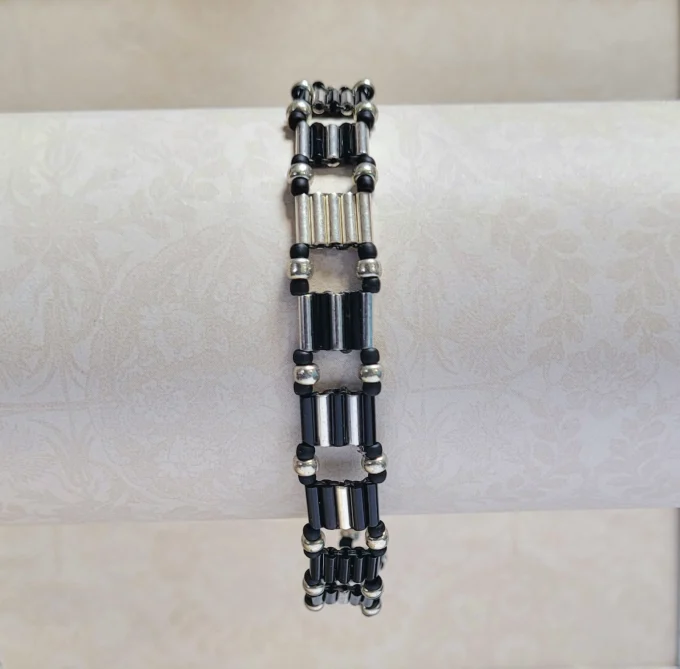 Bugle beads of black and silver make up links joined together by seed beads.