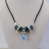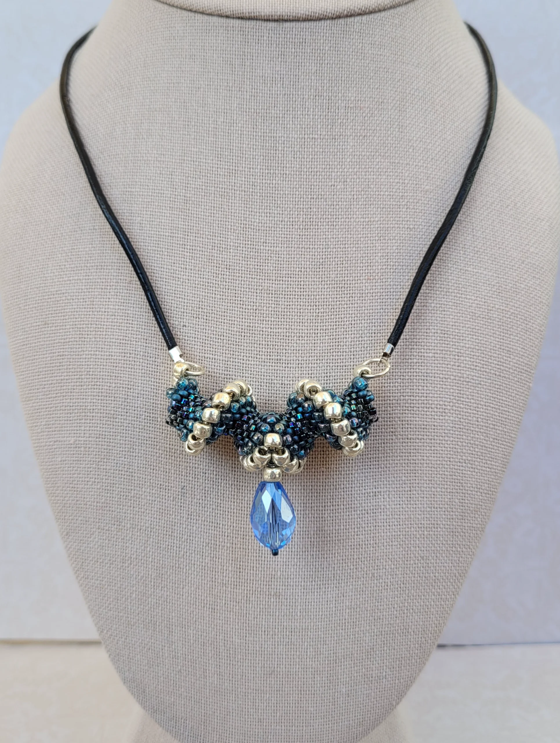 A blue crystal drops from a short spiral of silver and iridescent blue beads. Black leather cord, silver round spring clasp.