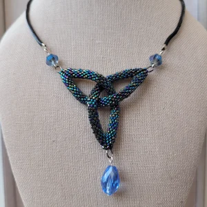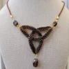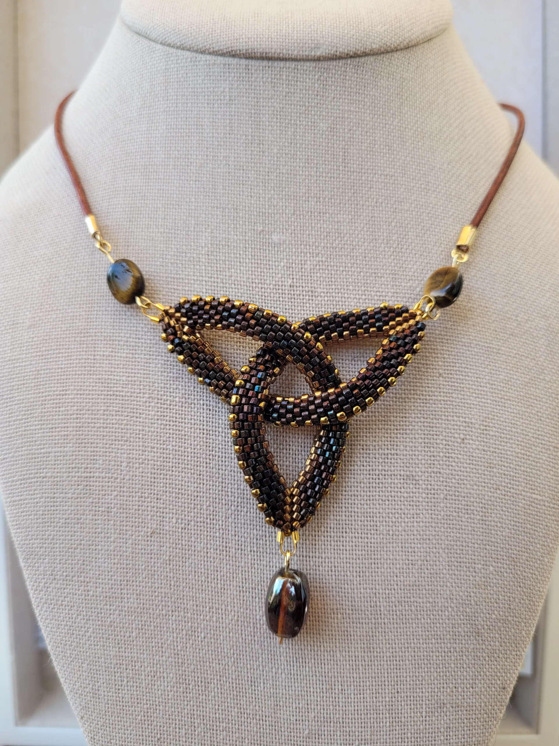 This is a true Celtic knot with ropes of bronze beads weaving in and out in a knot. Finished with Tiger’s Eye glass crystals, brown leather cord, and bronze-colored S clasp.