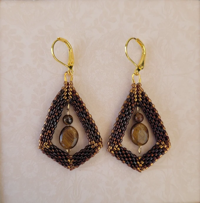 Long diamond shapes of variegated dark and light bronze-colored beads form a 3D frame for genuine Tiger’s Eye beads. Gold-filled leverbacks.