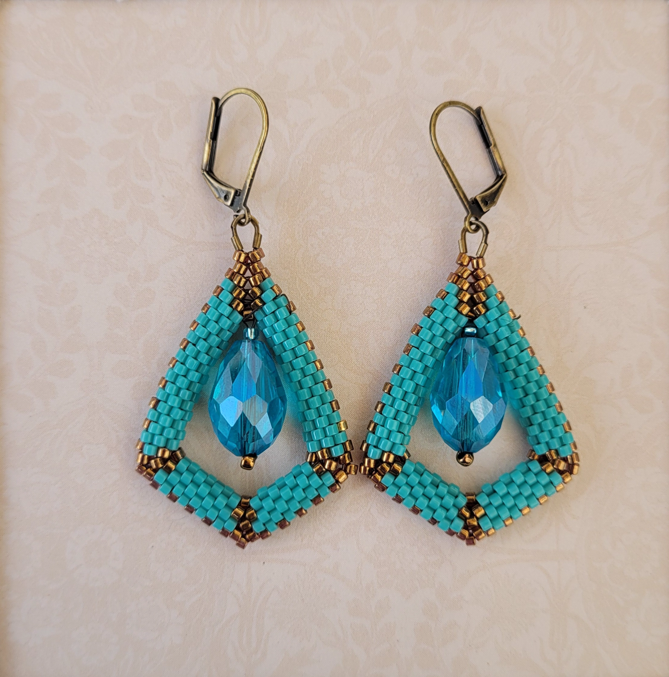 Long diamond shapes of turquoise and bronze-colored beads form a 3D frame for a luminous turquoise briolette pendant. Antique bronze finish leverbacks.