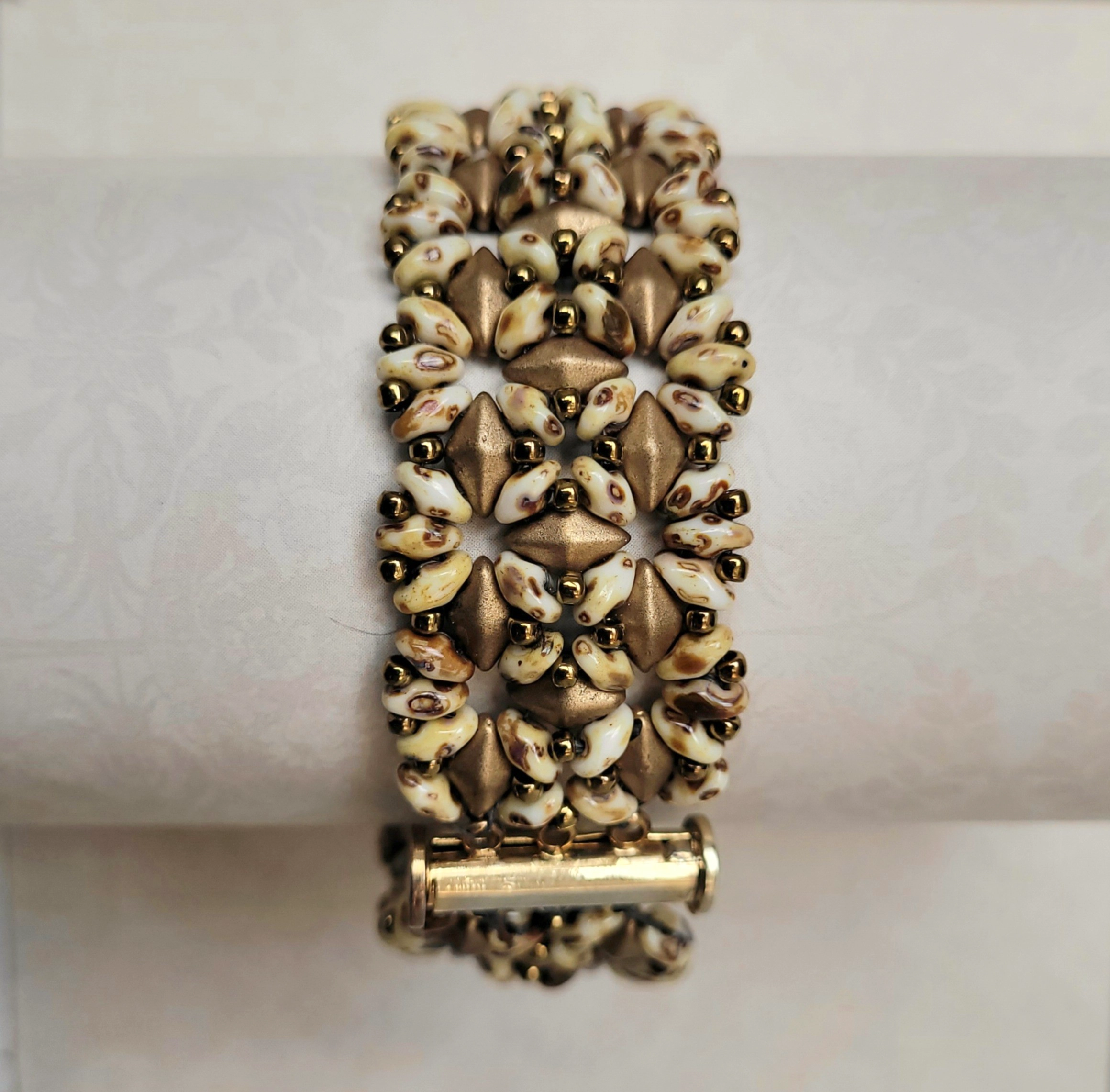 Matte gold and sand Czech glass beads, gold magnetic clasp.