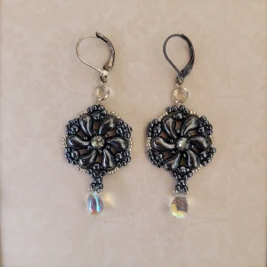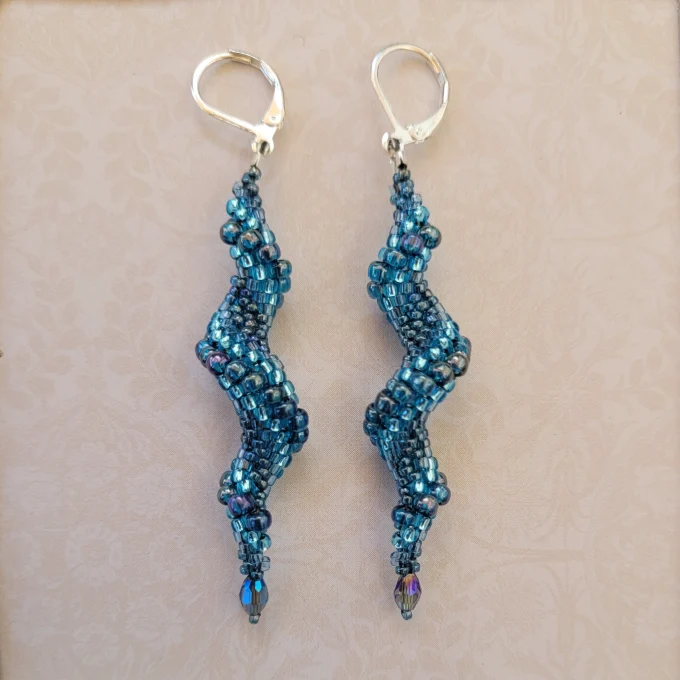 True spiral earrings made with a spectrum of bright sunny blue beads that playfully fall to an iridescent crystal bead. Silver leverbacks.