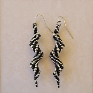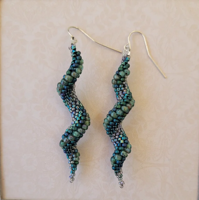 These earrings combine soft greens and blues in a playful spiral. Silver earwires.