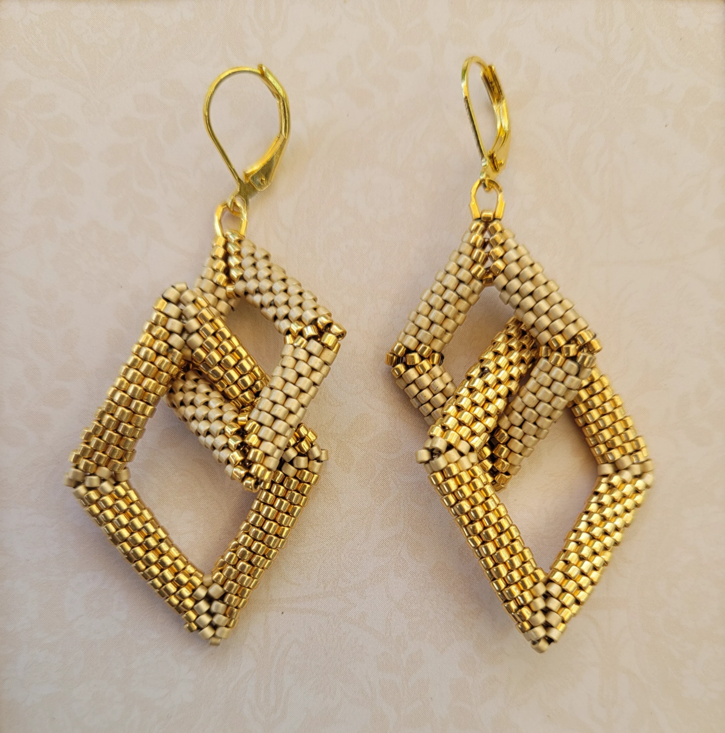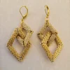 Playful 3D diamond shapes of bright and honey gold. The larger diamond moves independently within the smaller one. Gold leverbacks.