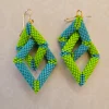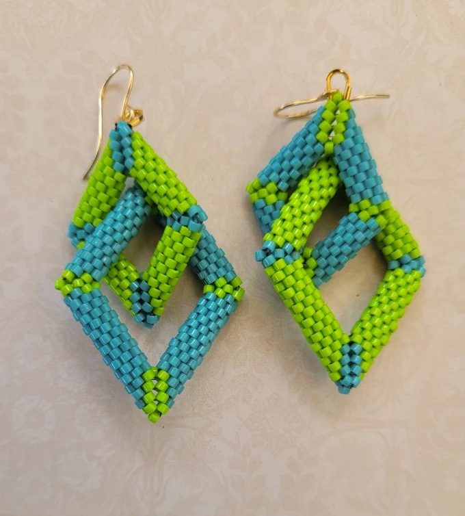 Playful 3D diamond shapes of light blue and spring green. The larger diamond moves independently within the smaller one. Gold earwires.