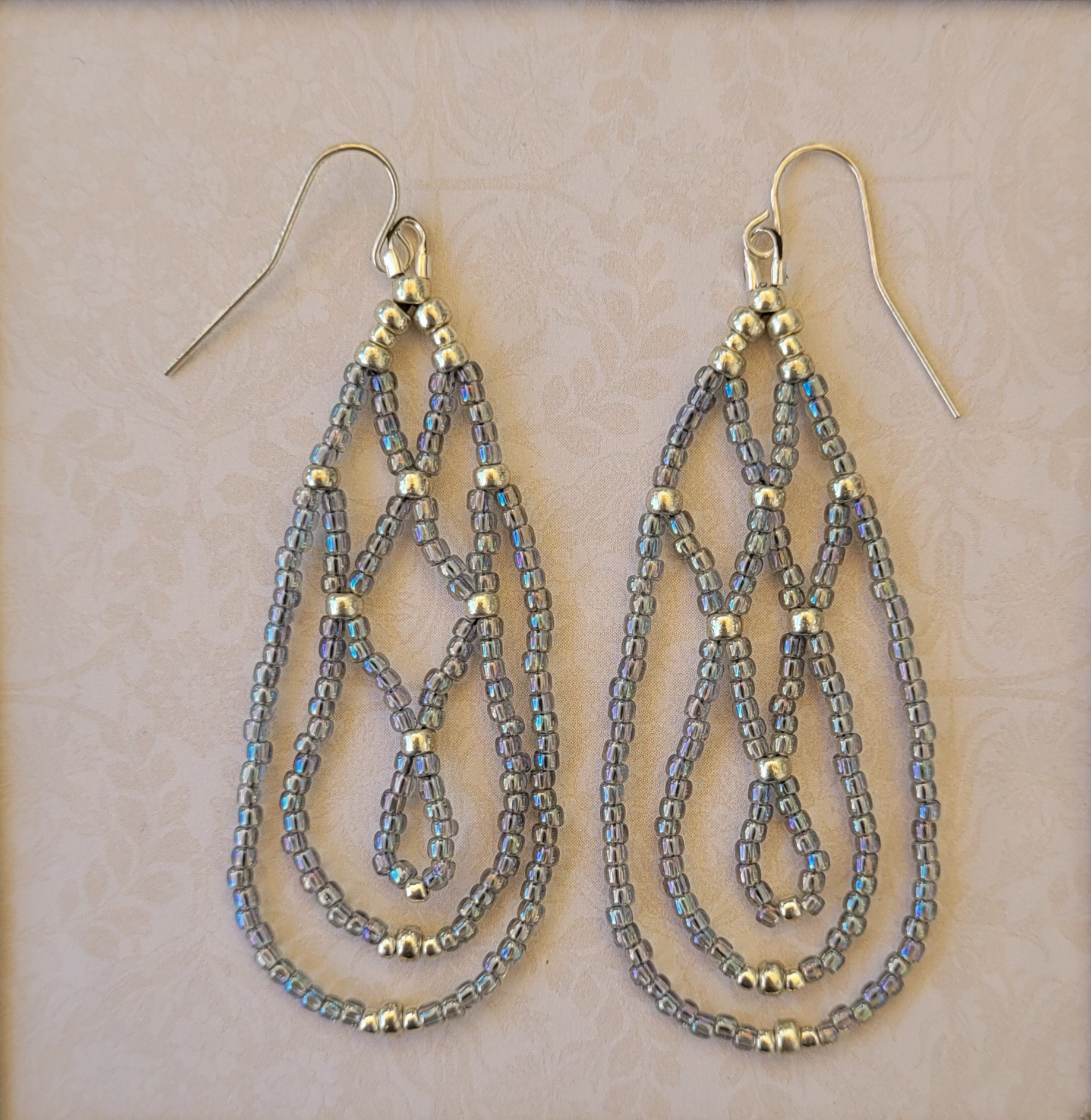 Strands of silver-blue seed beads interweave to make free swinging earrings that would be an asset to any festival outfit! Silver earwires.