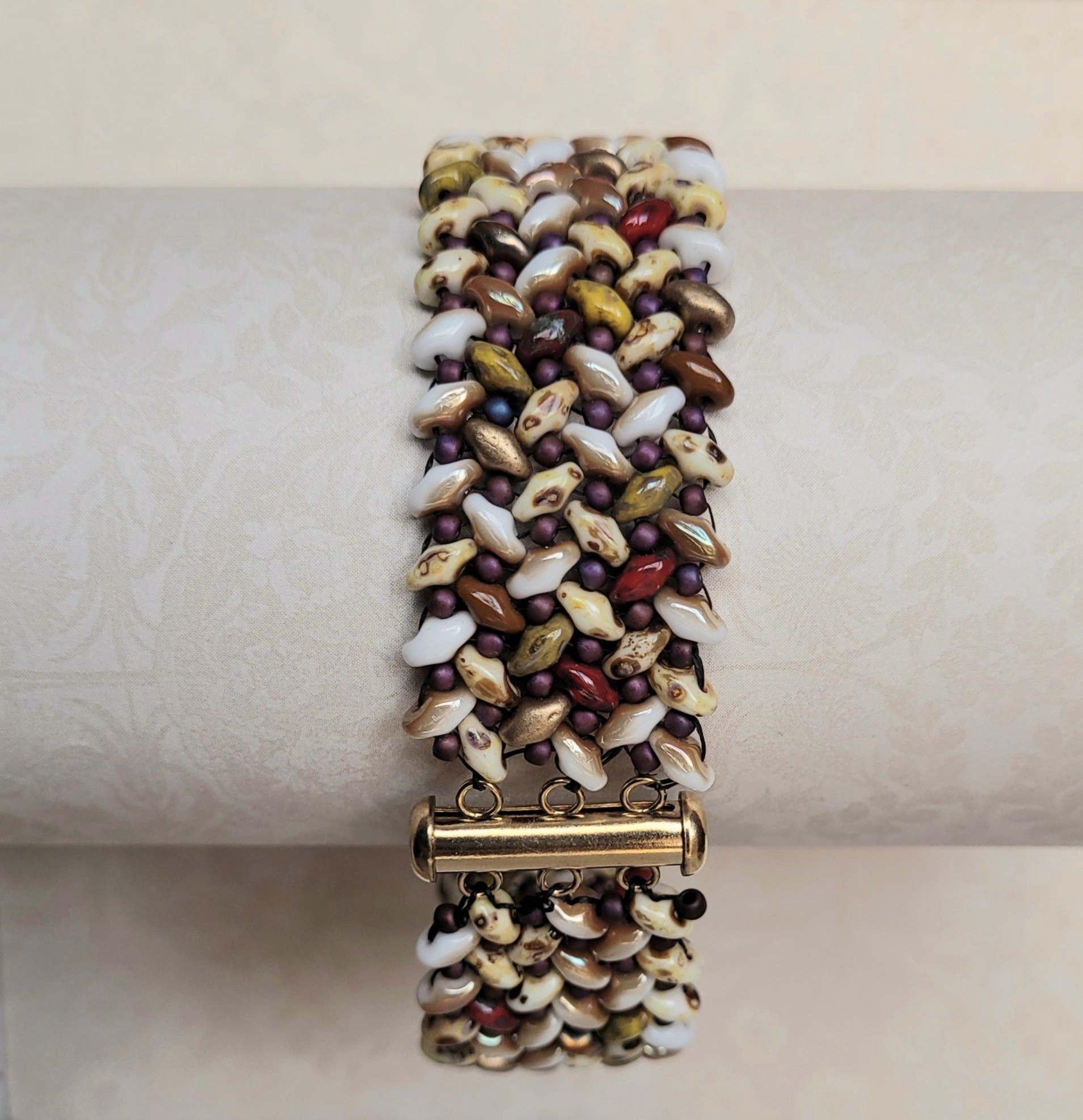 Beach sand and crimson SuperDuos, terracotta seed beads, gold slider clasp.
