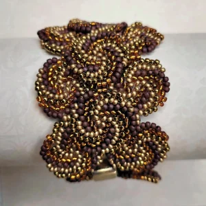 Beach sand and crimson super duos, terracotta seed beads, gold slider clasp.