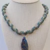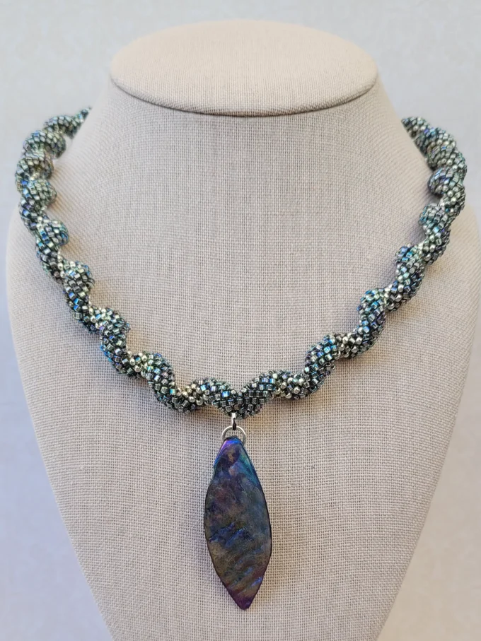 Pendant is 2 inches long. A spiral of iridescent and silver beads creates this piece sure to stun. Pendant has a mother pearl sheen. Silver metallic magnet clasp.