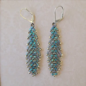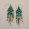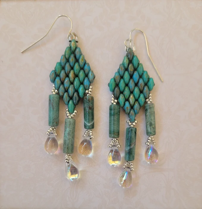 Green agate columns and crystal teardrops descend from diamonds of jade colored beads. With silver bead details and silver earwires.