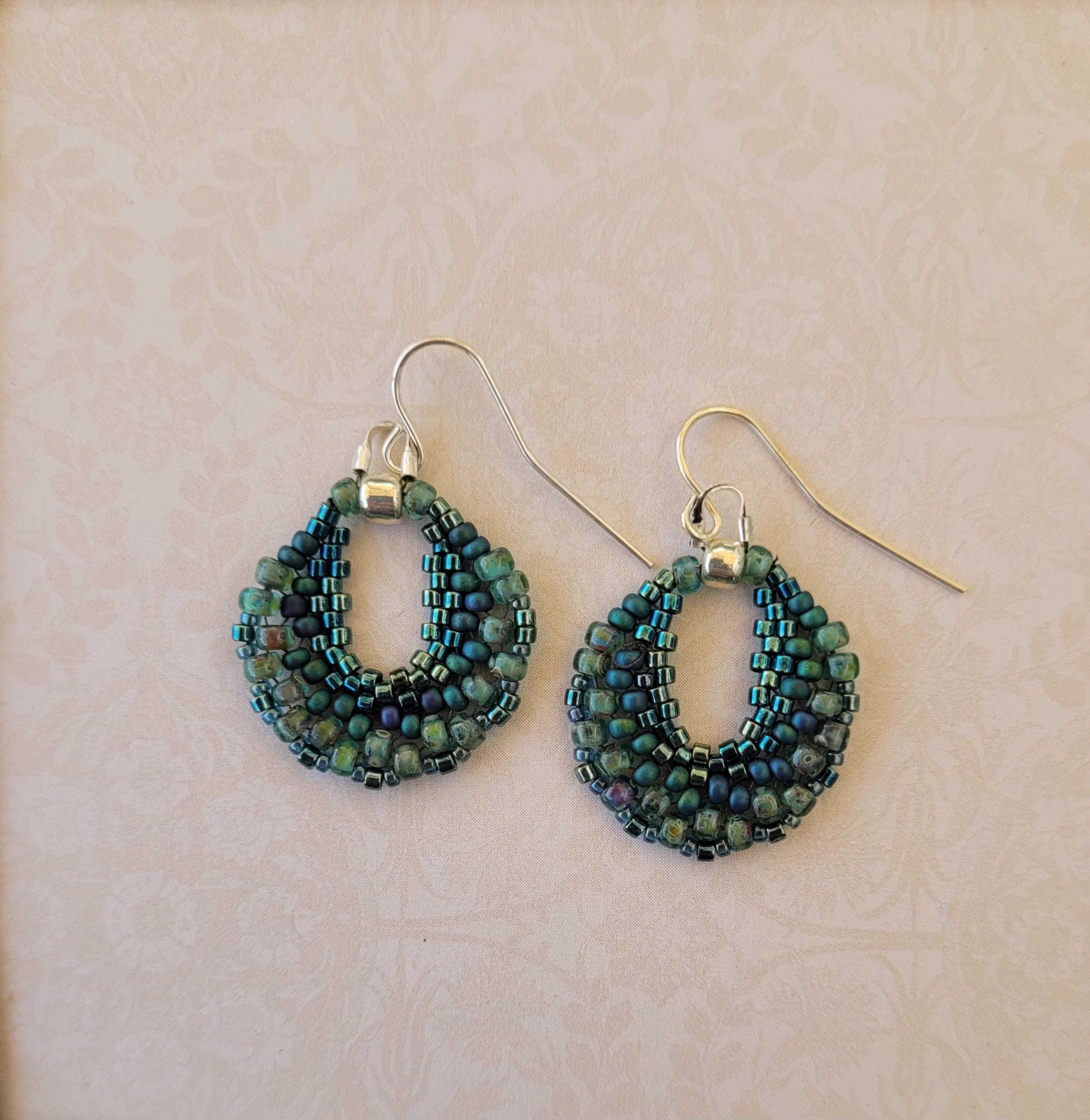 Green beads from bright metallic to soft moss in the broad round shape of a lilypad. Silver earwires.