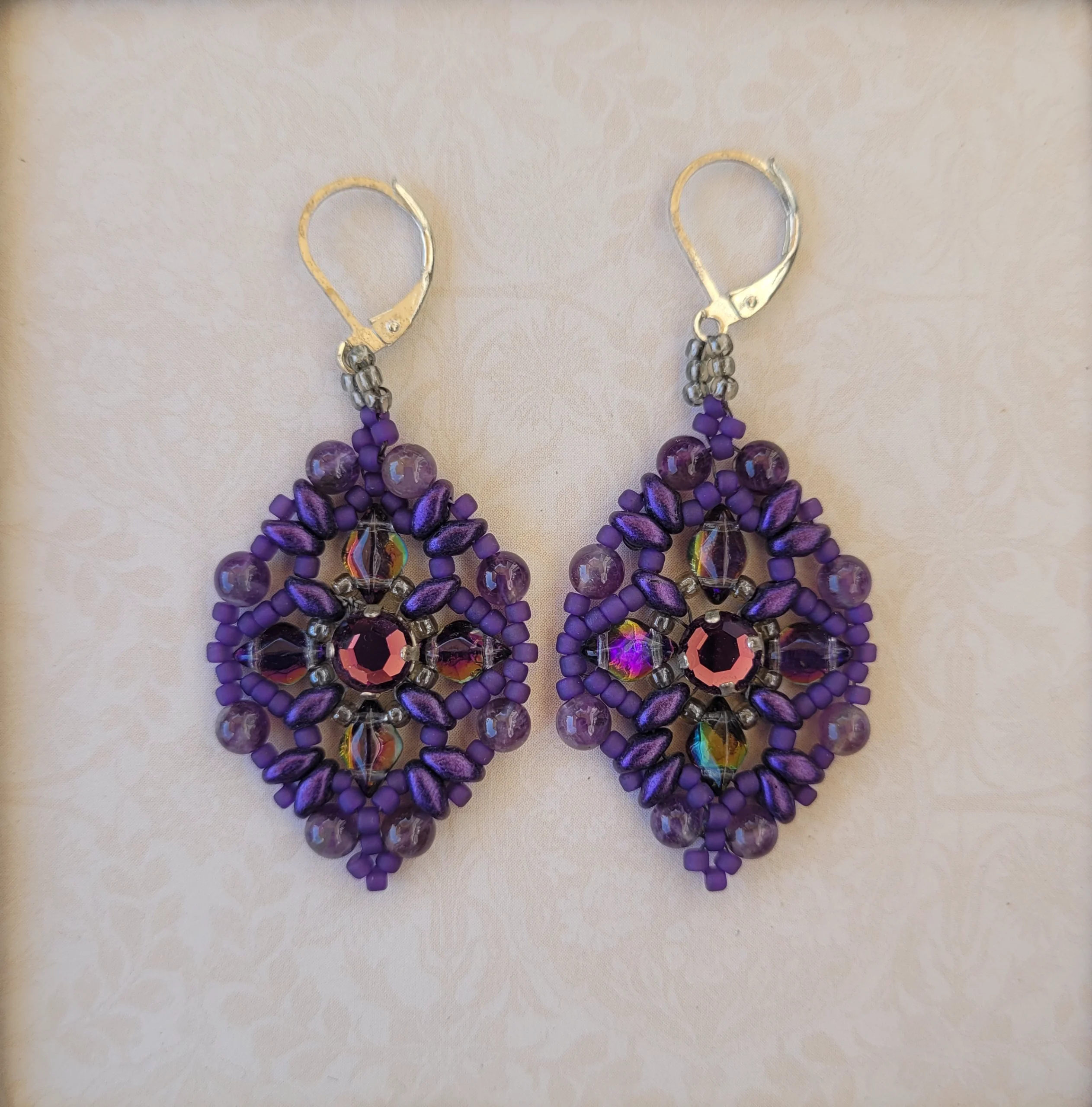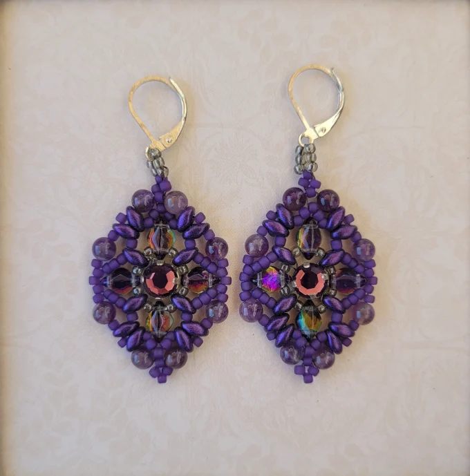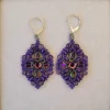 Deep purple seed beads, amethyst pearls and glass diamonds surround a purple Swarovski crystal. Silver leverbacks.