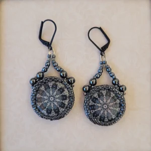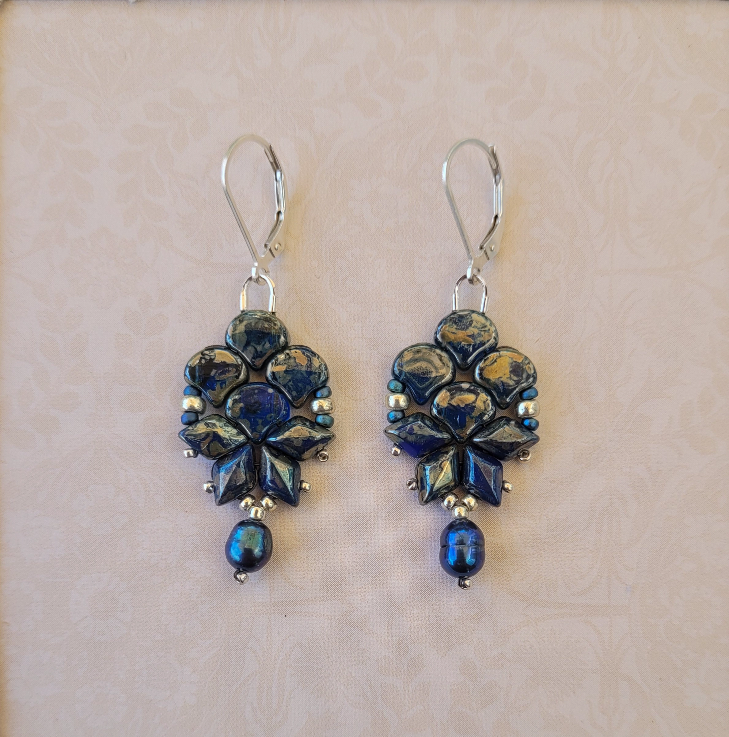 These earrings are made with deep blue beads that have a silver dappled coating like moonlight on waves. Silver accent beads and a blue natural pearl focal bead. Silver leverbacks.