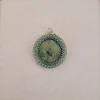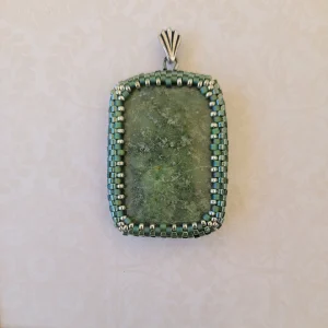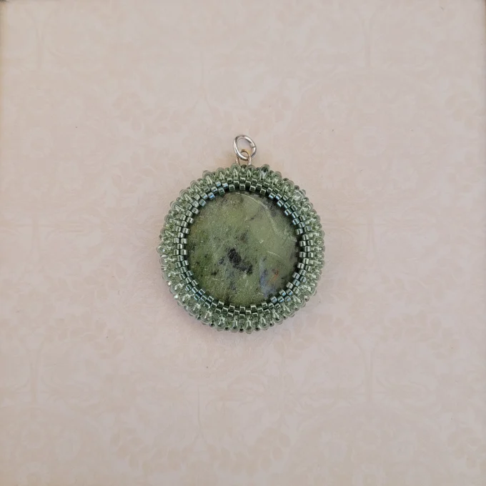 Beautifully veined green agate disk bezelled in olivine and sea green glass beads.