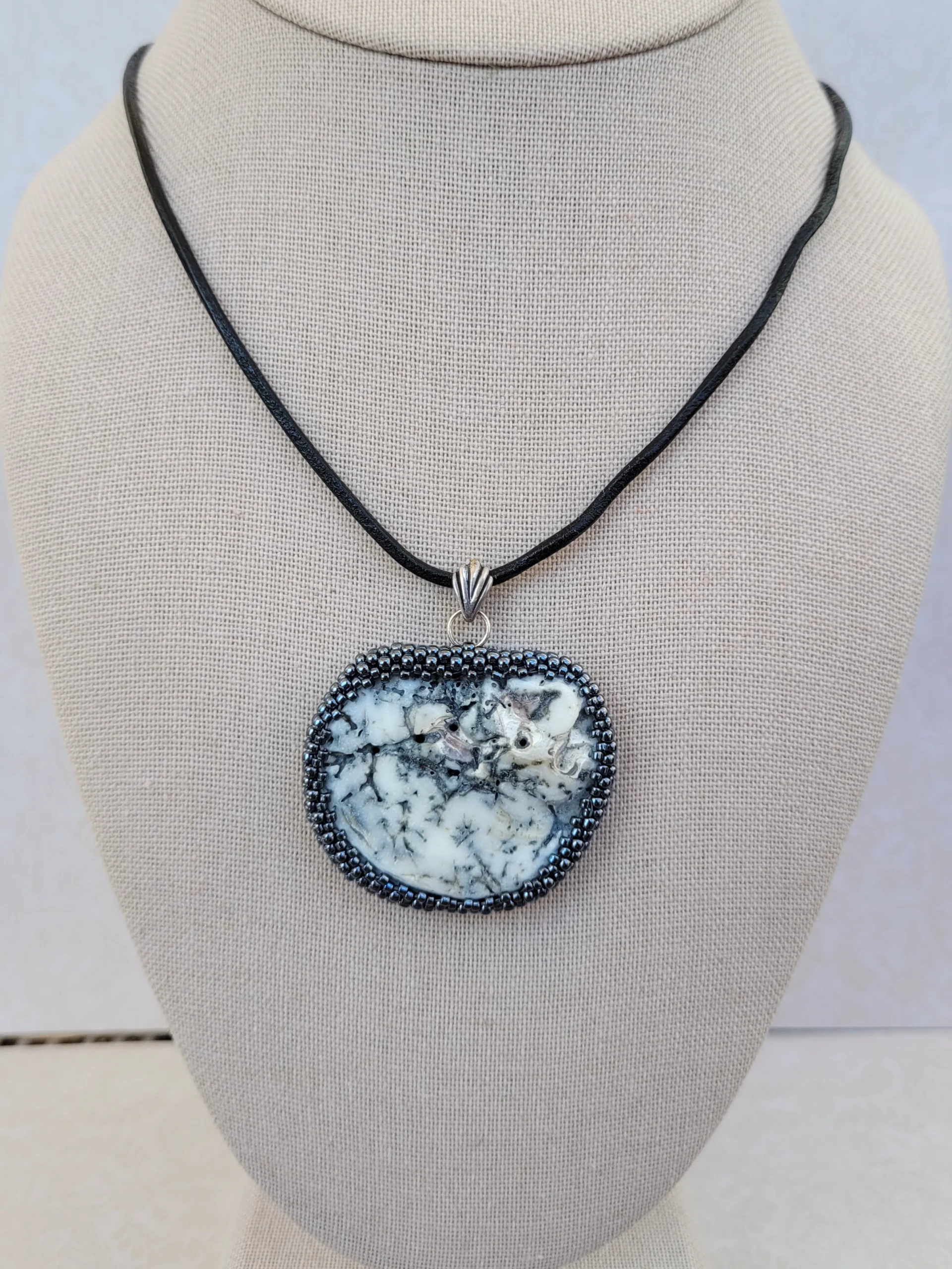 Natural, black and white shell bezelled in hematite seed beads.