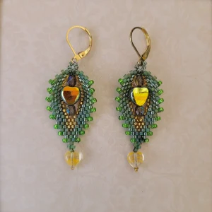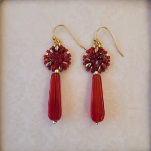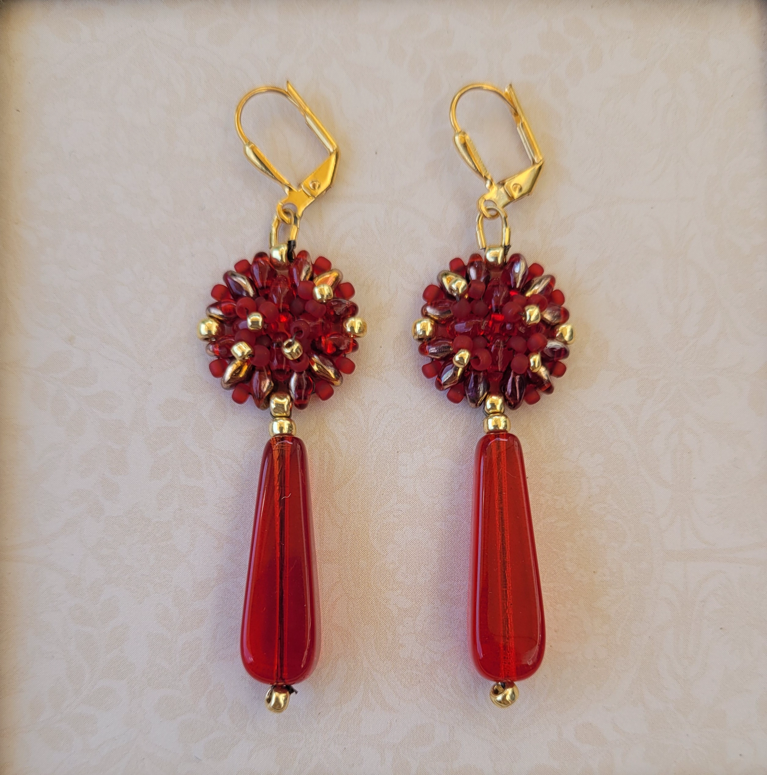 A floret of ruby and gold blooms over a dramatic ruby glass dangle. Accented with gold seed beads and gold earwires.