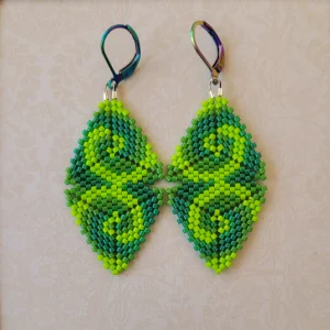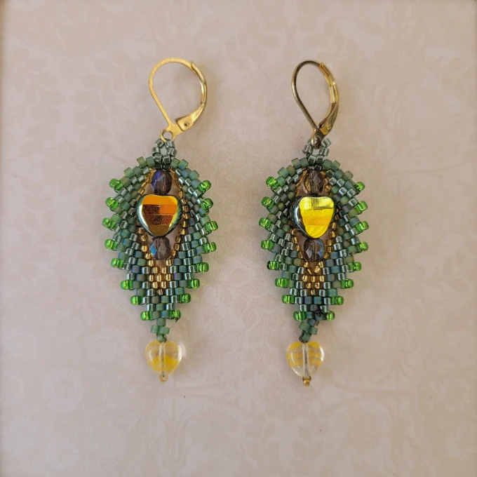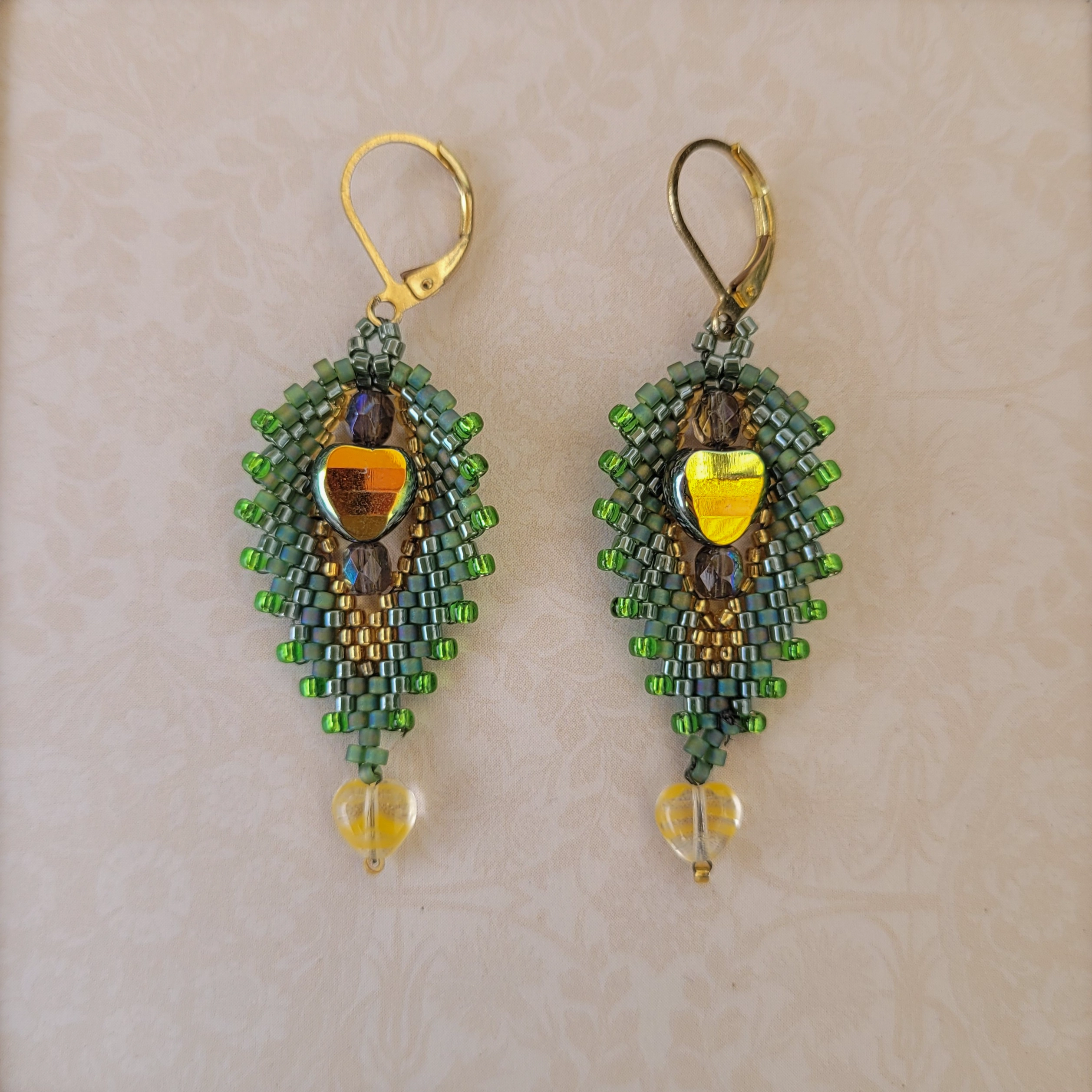 A green crystal bead suspended in a oval frame of green and gold seed beads with a golden heart-shaped dangle. Gold leverbacks.