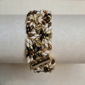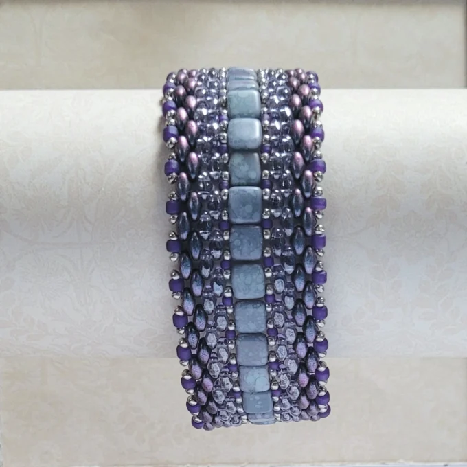Purple, tanzanite, and silver beads around moondust tiles with a silver magnetic clasp.