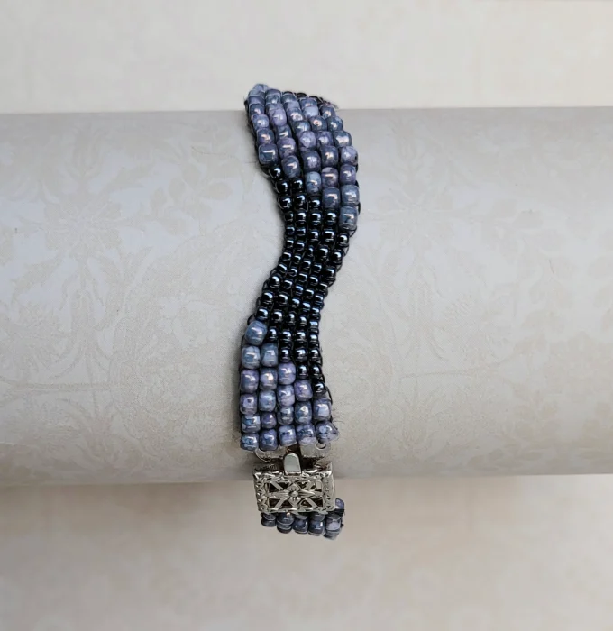 Hematite and moondust beads in a parade of sizes form these soft waves. Silver box clasp.