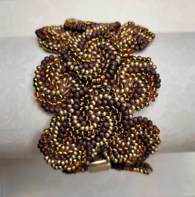 Swirls on swirls of seed beads in gold, copper, root beer, and soft brown make up this eye catching bracelet. Brass magnetic tube clasp.