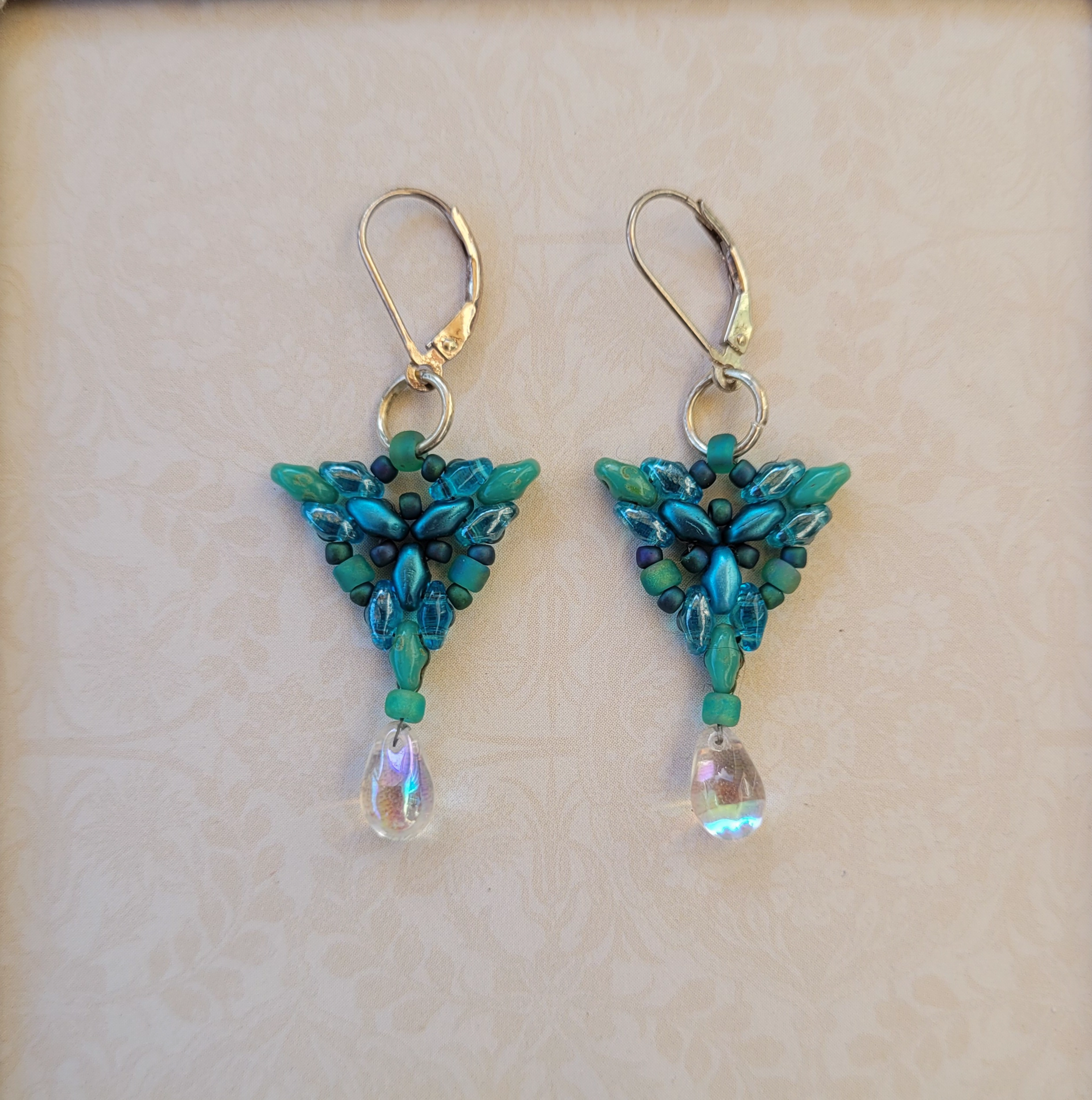 Jade and Aqua SuperDuo and seed beads, with a crystal dangle. Silver leverbacks.