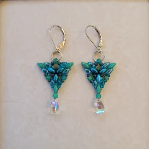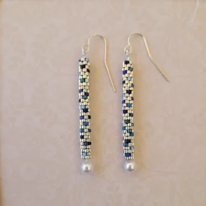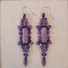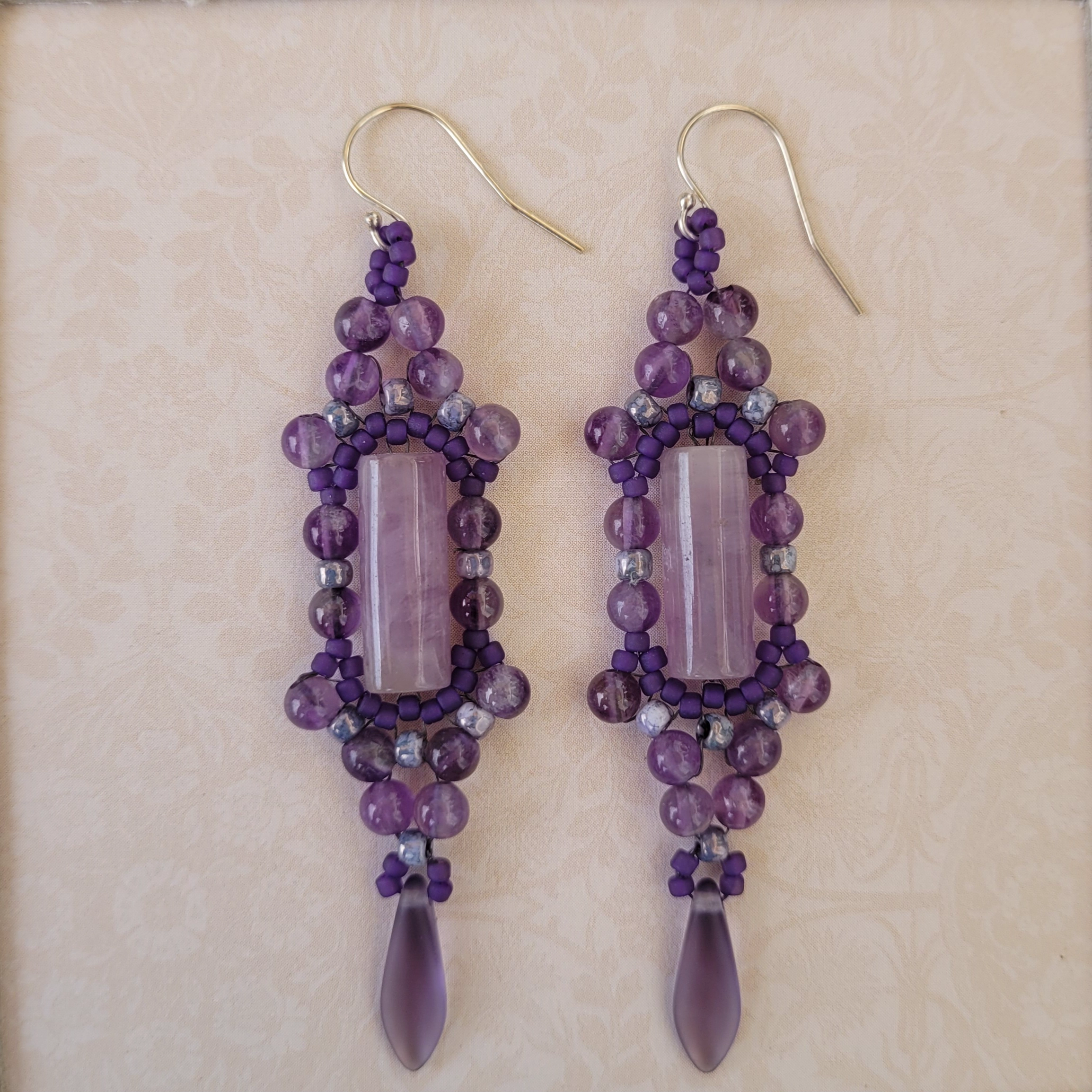 A window-scape of purple and moon-gray beads surrounding a columnar bead of amethyst agate. With purple crystal beads and silver earwires.