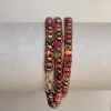 This wrap bracelet is made of a spectrum of autumn-colored (bronze, red, orange and ochre) SuperDuos matched with bright copper seed beads. Gold-filled magnetic clasp.