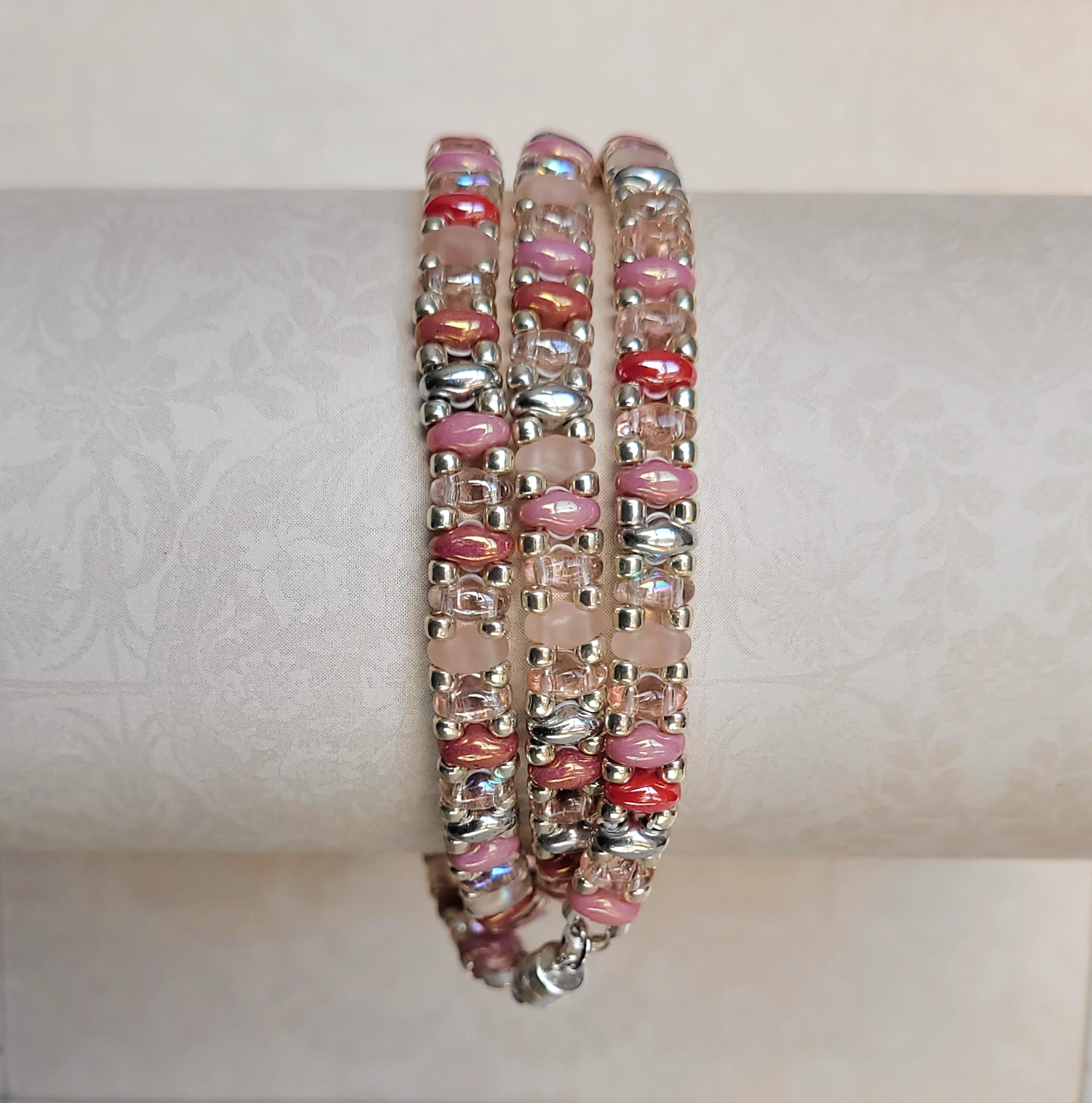 This wrap bracelet is made of pinks and crystal SuperDuos and silver seed beads. Stirling silver magnetic clasp.