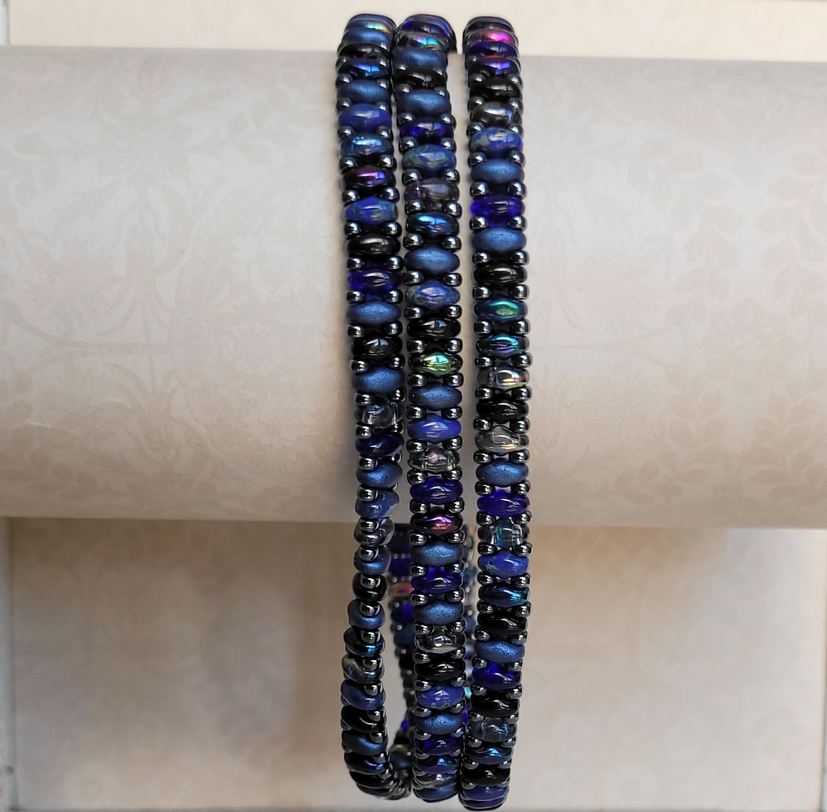 Made with a larger wrist in mind, this wrap bracelet is made of a spectrum of dark blue SuperDuos wiht hematite seed beads. Stirling silver magnetic clasp.